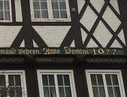| 18:44, 29. Jul. 2019 | Fachwerkhaus 1677.jpg (Datei) | 296 KB | Detail einer Fachwerkhausinnschrift aus dem Jahr 1677. Bild: Eigenes Werk | 1 | |