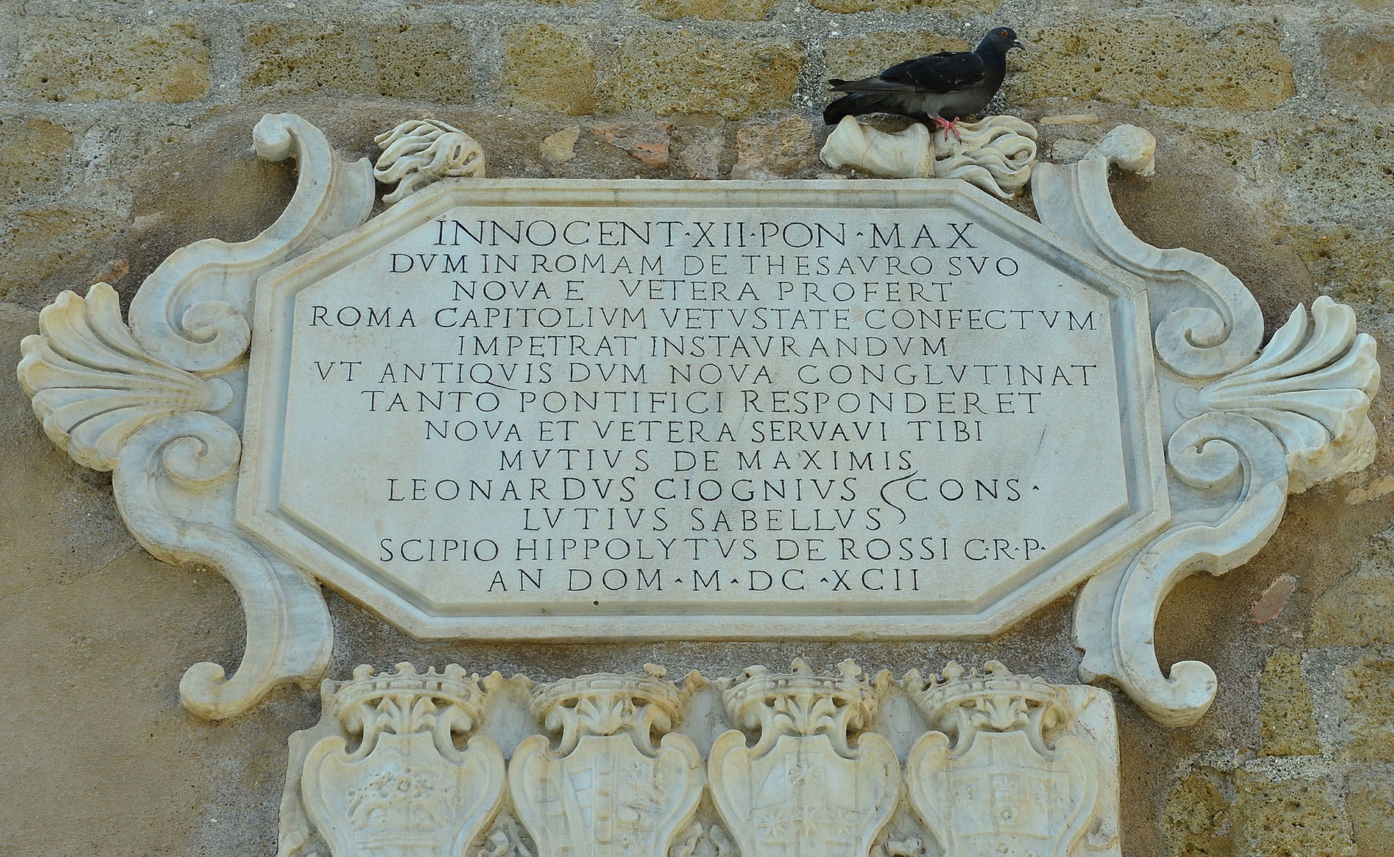 Eine Tafel für den Papst Innozenz XII. mit der Inschrift in römischen Zahlen MDCXCII (Jahr 1692).