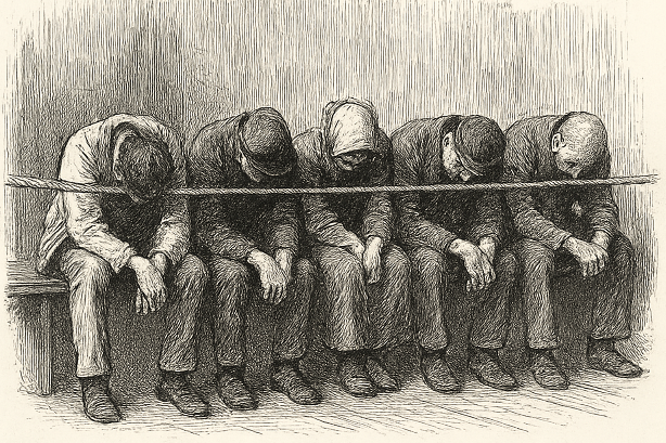 Ein penny sit-up als Schlafplatz in einer Unterkunft, wie sie George Orwell in Down and Out in Paris and London beschreibt. Eine KI-generierte Darstellung, abgelehnt an zeitgenössische Skizzen.