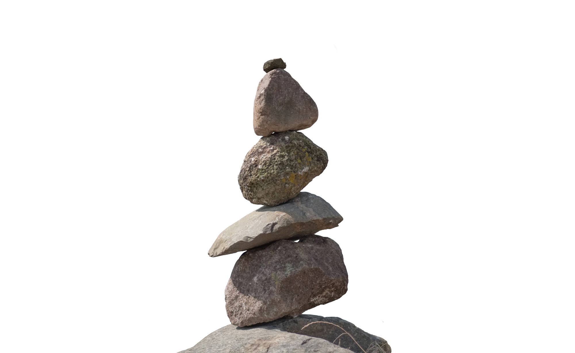 Zu einem Steinturm aufeinander gestapelte Steine über weißem Hintergrund.
