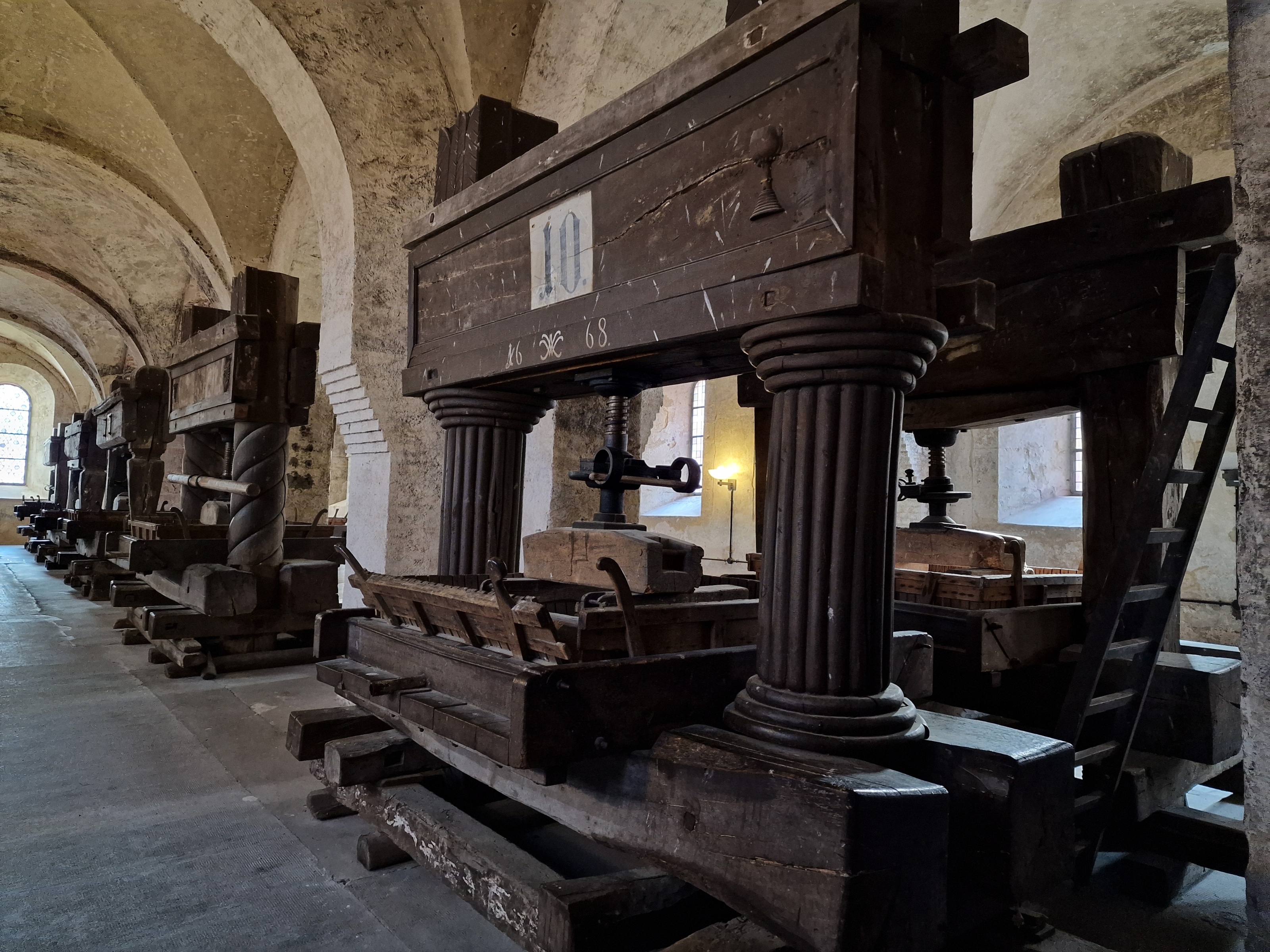 Eine Weinpresse aus dem Jahr 1668 im Kloster Eberbach.