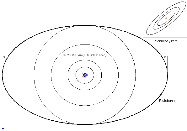 • Plutos durchschnittliche Entfernung von der Sonne ist 40-mal größer als die Entfernung Sonne-Erde.[1]