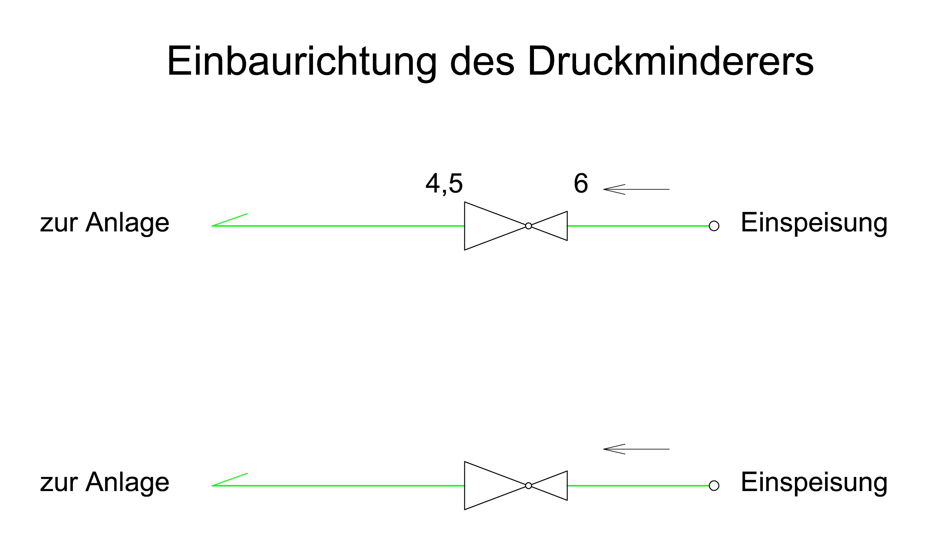 Einbaurichtung eines Druckminderers im Grundriss oder im Schema.